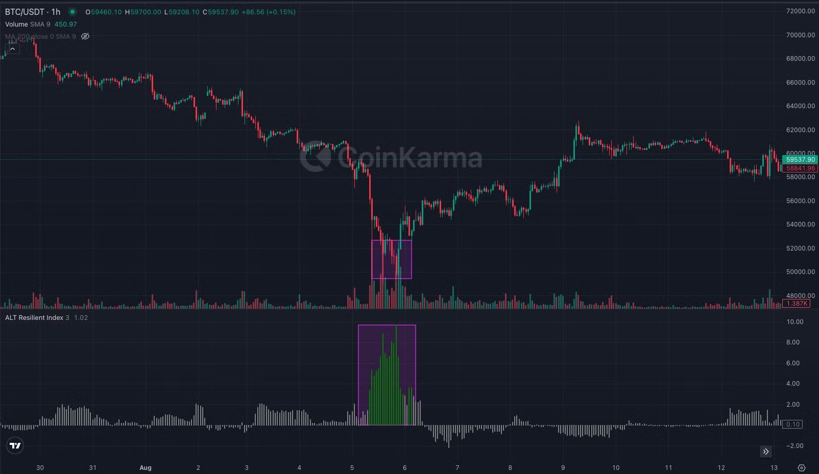 This is an altcoin resilience indicator, used to assess how altcoins hold up against BTC during market downturns. The higher the value, the stronger the altcoins perform during a decline. It’s useful for identifying potential market bottoms.