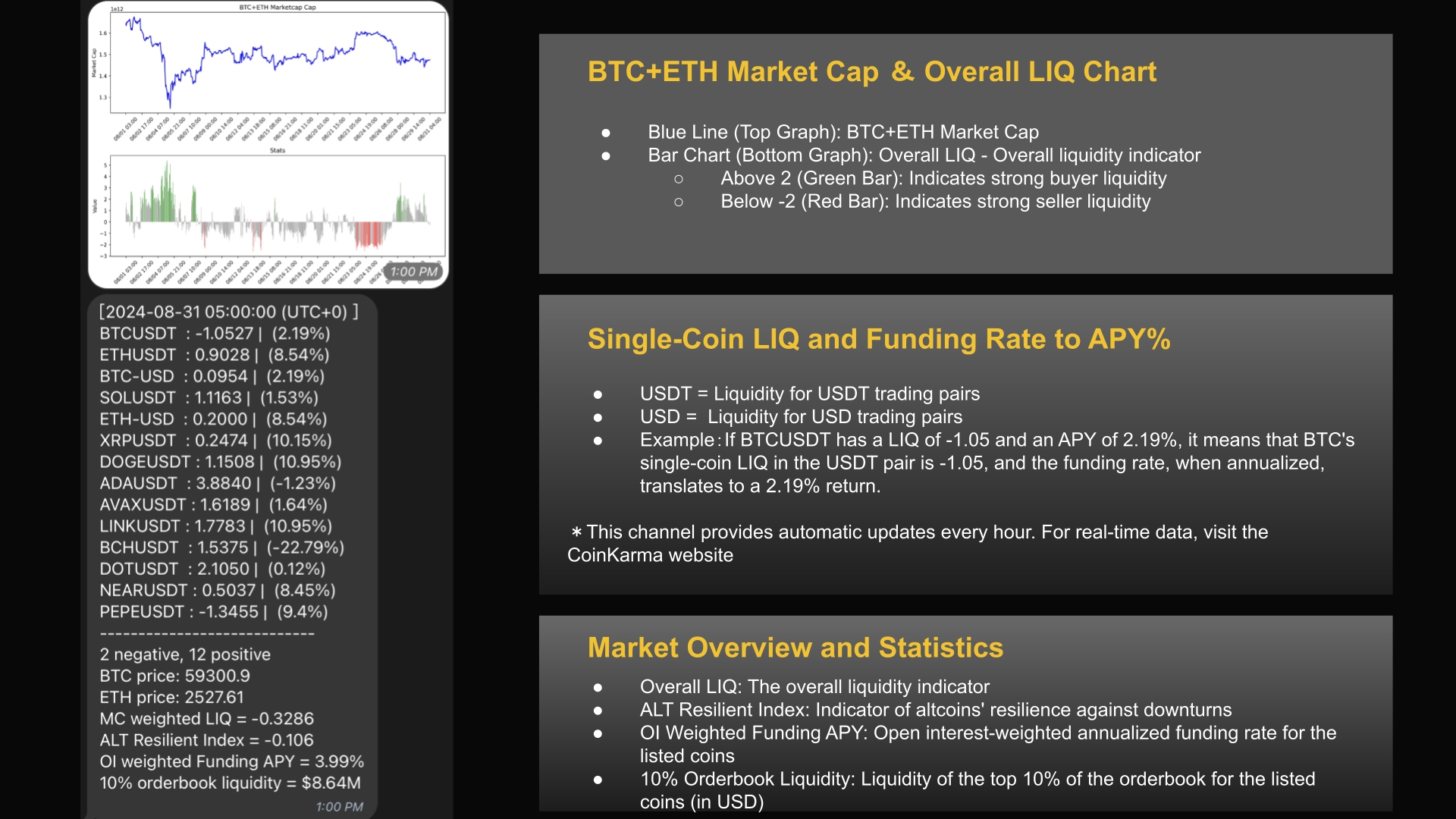 📢 Overall Liquidity Alert: Broadcasts hourly updates on the market cap of BTC + ETH, the liquidity status of various coins, and real-time data of the market-cap-weighted Overall LIQ indicator.