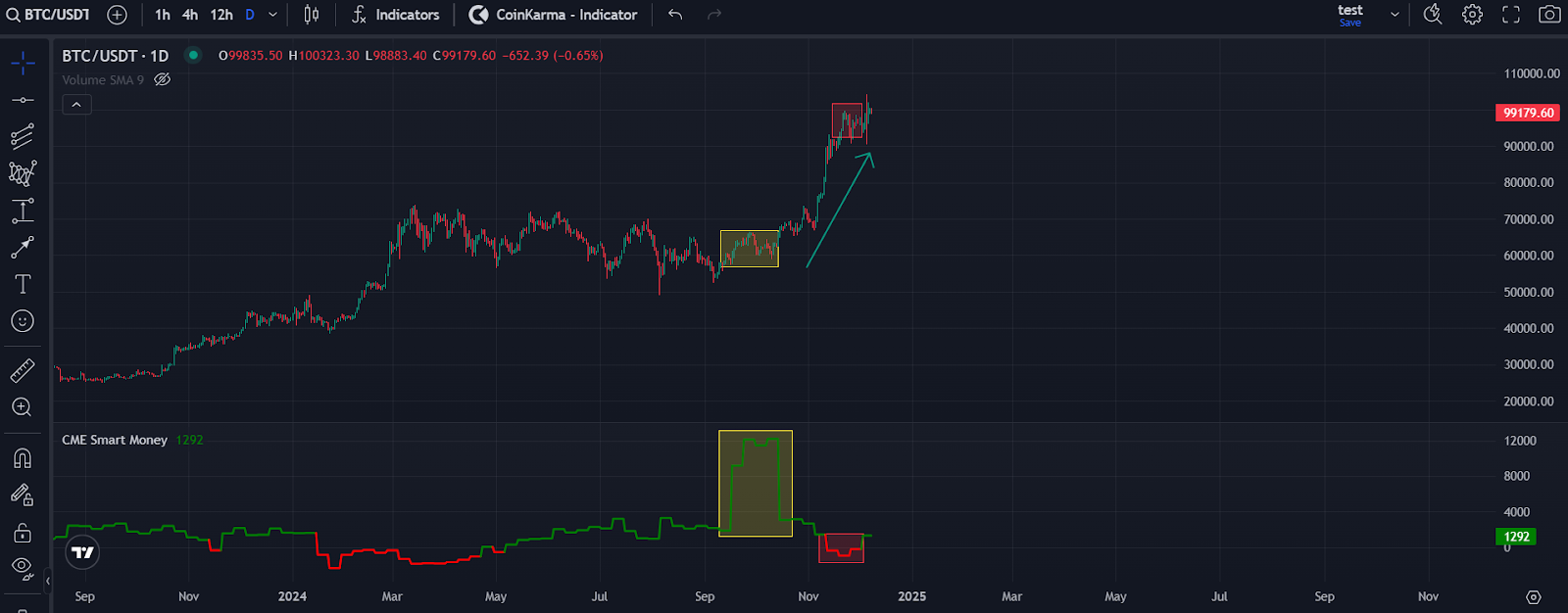 In October 2024, CME Smart Money increased positions from 1,800 to 12,000 contracts, marking the largest holdings and addition of contracts in recorded data. Following this, BTC entered a one-sided rally, surpassing the $100K milestone.