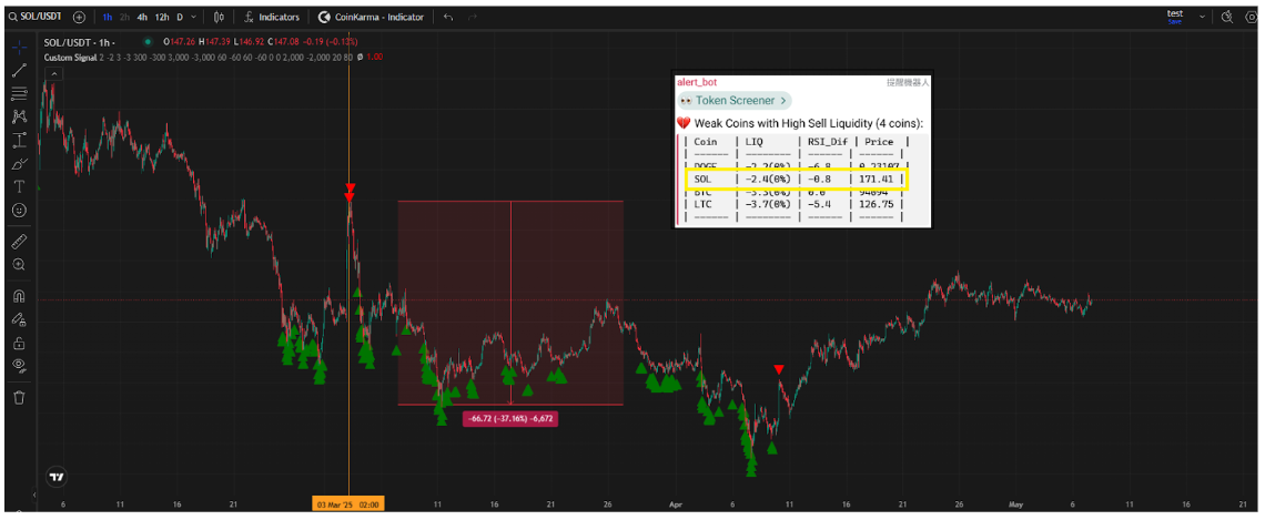 於 Token Screener 弱勢幣種名單出現，並透過 Custom Signal 發現整體市場流動性數據支持 ( 紅色箭頭 )，後續 $SOL 出現大幅回調，跌幅超過 $BTC。